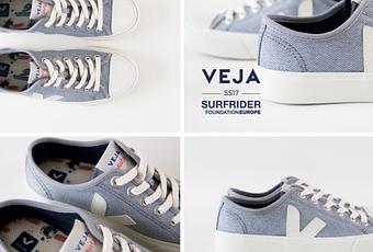 La nouvelle collection Veja, de coté, reste en Europe : Une paire de baskets façon denim, fabriquée entièrement en matériaux recyclés, Imaginées en collaboration avec l'association Surfrider Foundation Europe.