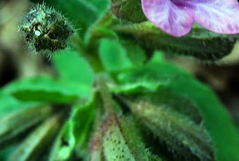 Pulmonaria obscura (Pulmonaire sombre) : plante munie de poils rudes au toucher, tige souvent anguleuse, feuilles basilaires d'été ovales, à base cordée, brusquement rétrécies en pétiole, non maculées, fleurs pourpre terne devenant violet sale.