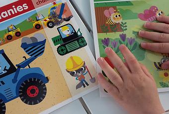 Déjà le petit format souple et carré me paraissait pratique pour commencer, pour une bonne prise en main et une facilité de transport, pratique à emmener partout. Je me faisais une montagne de cette activité et finalement c'est encore mieux que les autocollants et c'est tout simple. Le principe est expliqué en étape "pas à pas" : -on sépare la feuille de décalcomanies de son papier protecteur-on pose l'image que l'on veut décalquer à l'endroit choisi sur les décors-ensuite avec la pointe d'un stylo ou crayon, on frotte sur toute l'image en appuyant fermement pour qu'elle se transfère sur le décor-on soulève doucement la feuille de décalcomanies-on tapote doucement sur l'image ou on appuie avec le doigt pour que ça colle bien.