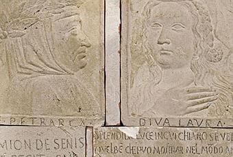Pétrarque et Laure. Bas-reliefs signé Simion de Senis, 1344, découverts à Florence.