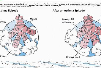 Inflammation des voies aériennes et bronchoconstriction lors d'un épisode asthmatique. Les voies aériennes rétrécissent et voient leur section diminuer du fait de l'inflammation, causant des sifflements.