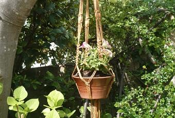 J'ai retrouvé ces deux suspensions dans mon armoire : j'avais acheté la plus grande il y a très très longtemps, dans les années 70. La plus petite avait été faite par un de mes enfants, à l'école. Je me suis décidée il y a un mois à chercher un pot pour chacune d'elles. J'en avais justement deux : l'un était vide, j'ai donc acheté un pétunia. L'autre contenait déjà une plante grasse qui fleurit au printemps. Il fallait une branche d'arbre assez solide pour les suspendre. Voilà le résultat.