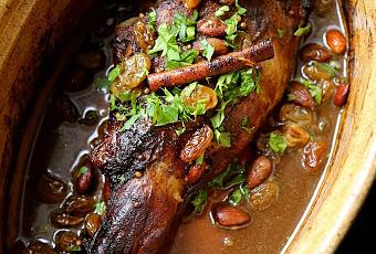 Au bout de 2 heures de cuisson ajoutez , les raisins secs , les amandes et le miel , mélangez la sauce et arrosez copieusement le gigot , renouvelez cette opération toutes les 20 minutes . Laissez cuire encore une bonne heure pour que la viande soit bien tendre ;