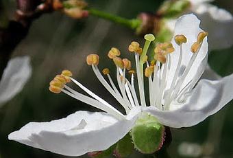 Prunus avium (Merisier) : arbre à écorce noirâtre lisse, gerçurée et se desquamant, feuilles alternes entières oblongues, dentées, face inférieure pubescente, pétiole pourvu au sommet de 2-3 glandes rougeâtres, fleurs à 5 pétales blancs, groupées en fausses ombelles, drupes noires à chair un peu amère.