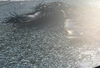 Posés sur la pelouse, des rectangles portent les photos de Thierry Fontaine, images mises en scène comme des îles, têtes couvertes de terre, perles, poissons et ballons de foot, évoquant les souvenirs mélangés, les rêves, les espoirs, non seulement du photographe, originaire de La Réunion, mais aussi des passants, des visiteurs, des personnes vivant ou travaillant dans les immeubles qui bordent les Terrasses de Nanterre. Sans doute, ces photos sont-elles ici prioritairement adressées aux habitants et aux employés qui en ont une vision d’en haut, mais le passant a le sentiment de glisser d’une photo à l’autre sur une sorte de tapis déplié depuis la Grande Arche. On en a une vision très différente de celle qu’on pouvait avoir, par exemple, au Mac-Val en 2012 quand elles étaient accrochées verticalement sur les murs du Musée.
