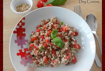 Pour 3/4 personnes : 200 g de sarrasin, 1.5 à 2 volumes d'eau de sarrasin, 1/2 cc de sel, poivre, 1/2 poivron rouge, une dizaine de tomates cerises, 2 tomates séchées à l'huile, basilic, 1 cs d'huile des tomates séchées