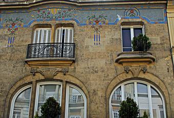 Des mosaïques de Guidicci en guise de couronnement. Claies des fenêtres et leurs soubassements en forme de vasques. 11 rue de Talleyrand.