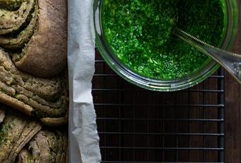 En optant pour une pâte à babka maison, j’ai voulu la faire avec de la farine complète afin de prononcer davantage le côté rustique – et la rendre un poil plus saine, tant qu’on y est. La texture en est cependant modifiée: alors que vous obtiendrez une texture aérée de pizza avec une pâte classique toute prête ou à la farine blanche, cette version complète donne une texture plus proche d’un pain moelleux. Pour le pesto d’ail des ours et chèvre, choisissez une bonne tomme de chèvre bien parfumée et légèrement fondante. Son arôme ne se sentira pas aussitôt après la préparation du pesto, mais après repos, on perçoit bien le côté acidulé et pétillant du chèvre. J’utilise généralement mon pesto dans les pâtes ou même en salade pour relever un peu son goût. Si vous souhaitez obtenir une babka au pesto d’ail des ours et chèvre encore plus riche, n’hésitez pas à y incorporer des morceaux de charcuterie ou encore des graines au moment de la tartiner.
