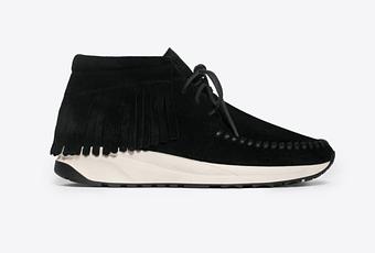 La marque parisienne a réussi à s’imposer comme une marque crédible sur le marché de la sneakers avec des sorties régulières de silhouettes d’une grande cohérence dans la lignée de leurs différentes collections. On découvre aujourd’hui deux nouvelles Native Run Mid habillées de leur traditionnelle frange inspirée des souliers amérindiens et rythmés d’imposantes coutures au niveau de la toe box. Cette paire offre une construction en suède déclinée ici en noire beige. La semelle fait le lien avec l’ADN streetwear de la marque avec une forme racée, volontairement athlétique qui tranche avec une empeigne élégante.