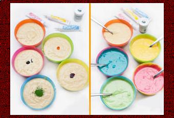 – colorants aux choix (gel ou poudre) jaune, rose, vert et bleu