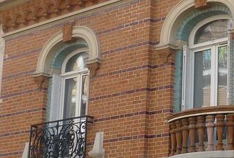 Jolies petites sculptures de têtes au dessus de la porte qui représente un couple. Le couple qui a fait construire la maison ?