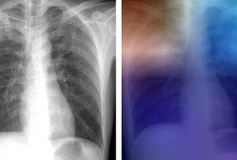 Un modèle qui peut atteindre 99% de précision : un modèle réalisé à partir de 1.007 images de patients avec et sans tuberculose active apportant de multiples jeux de données de radiographie thoracique a permis aux chercheurs de développer plusieurs modèles d'apprentissage approfondis qui testés sur 150 cas ne sont en désaccord avec le diagnostic radiologique humain que dans 13 cas seulement. Avec la participation (réduite ou à distance) d'un expert humain, la précision nette du modèle atteint près de 99%. L'exemple est donné ici avec l'image couleur ci-contre : les zones rouges et bleu clair dans les lobes supérieurs représentent les zones activées par le réseau neuronal profond de " l'intelligence artificielle " . Le réseau se concentre ainsi sur des parties de l'image où la maladie est présente (les deux lobes supérieurs).