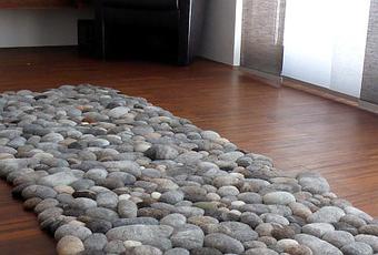 Description : "Le tapis feutré est composé de galets de différentes formes et tailles. Chacun est unique et personnalisable en taille et en forme. "