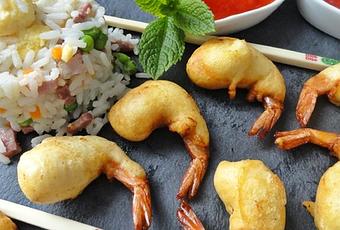 500 g de grosses crevettes roses ... mes crevettes étaient de taille moyenne et je n'ai fait que 260 g car je voulais un accompagnement en plus (riz cantonnais) mais j'ai gardé les mêmes doses d'ingrédients pour pâte/marinade