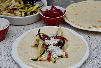 Garnir les wraps avec les légumes, des pickles d'oignons rouges, arroser de sauce et déguster!