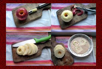 Sans les couper, retirez le trognon à l’aide d’un vide pommes et couper les pommes en rondelles de 0,5 cm d’épaisseur, ( 20 rondelles )