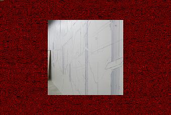 Au sol, quelques rares pièces de tissu (chemise ou couverture) se détricotent et filent. Les fils de leur existence s’étirent ensuite jusqu’aux murs et plafonds et y tracent des dessins… Ces fils de soie ou de coton occupent toutes les surfaces, réalisant comme des croquis d’architectes, des plans de bâtiments ou de cités imaginaires. Les traits sont fins et très discrets (collés ou agrafés). Pourtant, ces grands aplats donnent l’illusion de volume parfois. Et, d’ailleurs, les fils quittent la surface de temps en temps pour traverser l’espace, rejoindre le mur d’en face ou la pièce d’à côté. Il y a une circulation. Un réseau. Des connexions.