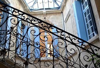 En rentrant dans l'hôtel on arrive dans une cour intérieure et l'on est tout de suite frappé par une sublime rampe en fer forgé inspirée de motifs végétaux. A droite avant de monter les escaliers je ne sais pas si vous voyez mais l'architecte a choisi de faire une clé pendante plutôt qu'une colonne qui aurait alourdie l'ensemble.