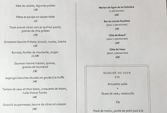 Au déjeuner, les formules sont malignes : une petite entrée imposée, un plat au choix entre viande et poisson du jour et un café / madeleine au miel. À la carte, les carottes rôties à la bergamote, cumin et noisettes jouent le croquant tandis que le velouté de châtaignes enrobe les tendres ravioles de potiron et comté. Le saumon mariné servi avec son quinoa joue l’acidulé grâce à la canneberge. En association terre/mer, la pluma ibérique accompagnée de topinambours s’acoquine avec les bulots en vinaigrette Pedro Rimenez. Pour les carnivores, l’épaule d’agneau de lait ou la côte de veau française, se découvrent avec leur chair moelleuse et délicatement assaisonnée – à partager de 2 à 4 personnes.
