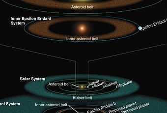 Illustration réalisée à partir des observations du télescope spatial Spitzer en 2008. Le système Epsilon Eridani est comparé avec le nôtre. Les indices supposaient alors la présence de deux anneaux de débris autour de l’étoile. Epsilon Eridani b, borderait l’anneau interne et une probable planète géante, comparable à Neptune, démarquerait l’anneau externe. La configuration de ce jeune système rappelle en deux nombreux points celle de notre Système solaire — Crédit : NASA, JPL, Caltech, R. Hurt (SSC)