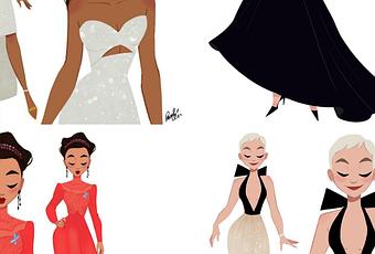 Illustrations des tenues favorites de l'artiste sur le tapis rouge : Naomie Harris, Kirsten Dunst, Ruth Negga, Michelle Williams.