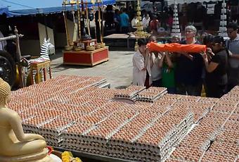 .Après que Sri Sutaram l'abbé de Wat Bang Phraait aspergé l'ensemble d'eau béniteLe bouddha a été habillé et, les oeufs distribués:A l'hôpital, aux temples de la région de Nakhon Chai Si,Ainsi que des repas scolaires et, a ceux qui le mérite
