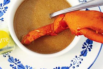 Faire mijoter pendant près de 12h (préférablement la nuit) dans une mijoteuse la carcasse de homard, l'eau, la bière. Lorsque votre bouillon est orangé après 12 heures, faites réduire le bouillon sur le poêle à feu moyen. Une fois réduit, ajouter de la crème à cuisson et le beurre, ainsi que quelques gouttes d'huile de truffe. Servir avec une pince ou une queue de homard.