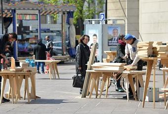 En itinérance dans le 93, les artistes Boijeot et Renauld ont habité l’espace public de la Seine-Saint-Denis tout le mois d’avril dernier. Mettant en place des chantiers participatifs, ils construisent des meubles dans la rue avec leurs outils et sont alors présents 24h sur 24 à l’extérieur, avec leur « unité de vie » (un lit, une valise, une table et des chaises). Présence politique qui interpelle, invitation au dialogue, source de questionnement, ils s’inscrivent dans le paysage urbain de la Seine-Saint-Denis dans une rencontre qui surprend les habitants. Leur traversée du 93 s’est terminée le 30 avril à la Courneuve, où les quelques trois cents meubles montés au cours des chantiers ont été offerts aux habitants dans le cadre du Festival Rencontre des Jonglages.