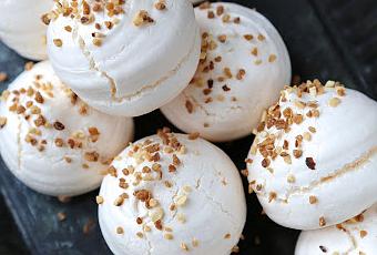 Utilisez une poche à douille munie de la douille 10 , dressez des sphères de 8 cm de diamètre sur une plaque de cuisson recouverte de papier sulfurisé (je colle la papier sulfurisé sur la plaque de cuisson avec un peu de meringue aux 4 coins de la plaque ) . Saupoudrez avec des graines , des fruits secs concassés , du cacao .... Cuisez les 1h15 à 1h20 heures selon la taille .