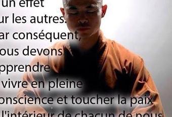 Nous sommes tous connectés. Lorsque vous touchez une chose, vous touchez tout. Tout ce que nous faisons à un effet sur les autres. Par conséquent, nous devons apprendre à vivre en pleine conscience et toucher la paix à l'intérieur de chacun de nous. La paix dans le monde commence par la paix en soi.