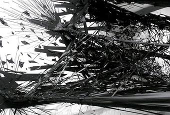 Cette installation déroge à l’horizontalité habituelle de ses compositions ainsi qu’à leur énergie naturelle. En l’occurrence, on passe de lignes tendues prolongeant la main à des verticales qui semblent pointer vers un même point.