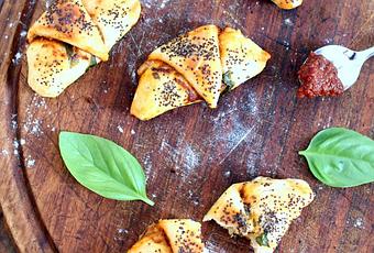 Des petits croissants avec une pâte maison express au cream cheese, fourrés aux tomates confites, basilic et mozzarella
