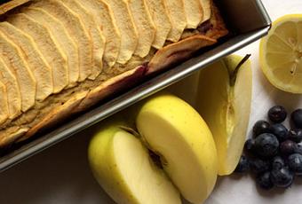 5. Rajouter une pomme coupée en petits dés, puis incorporer délicatement les myrtilles avant de verser la pâte dans le moule.