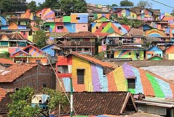 Tout a commencé lorsque le directeur de l'école secondaire Slamet Widodo, 52 ans, a décidé d'améliorer les habitations de sa communauté. Il a proposé à l'état de peindre les 390 maisons de Kampung Pelangi, son village natal, avec des couleurs vives. Le gouvernement a donné 22 000 $ à la mairie pour commencer la transformations des habitations.
