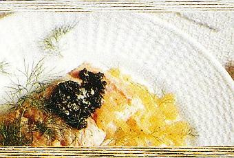 Fiche technique : Pavés de saumon à la purée d'olive et aux oignons fondants