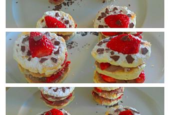 7- Étaler la crème pâtissière sur un disque de pâte et déposer dessus quelques morceaux de fraises.