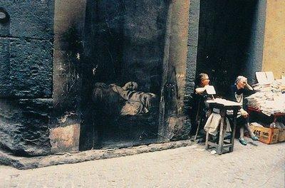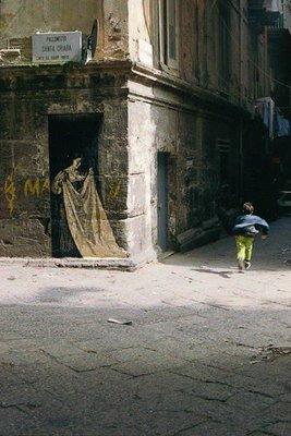 Ernest Pignon-Ernest à NaplesOn ne part pas à la recherche des œuvres d’Ernest Pignon-Ernest comme on irait dans une galerie voir rassemblés les derniers travaux d’un artiste. Essentiellement éphémères, ces œuvres, placées aux coins des rues, livrent leur étrange beauté jusqu’à ce que les intempéries ou des affiches concurrentes les en délogent. On ne peut les connaître alors que par des dessins préparatoires ou des photographies. Il paraît cependant qu’il resterait à Naples quelques travaux de l’artiste, réalisés au début des années 1990 et préservés grâce aux soins des habitants.