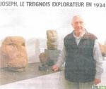 Le vendredi 20/06/2008, j'ai voulu revoir l'exposition de Treignes dont le vernissage a eu lieu le 09/02/2008 (cf pages précédentes de ce blog) et qu'elle ne fut pas ma surprise de voir encadré un article du journal "Vers l'Avenir" (édition entre Sambre et Meuse) daté du samedi 03/05/2008. Il s'agit d'un article à propos d'un Treignois venu visiter l'exposition en voisin car il habite la rue de la Gare, n° 48 et le musée est situé rue de la gare n° 28. Cette personne s'appelle Joseph Droeven et a fait partie de l'expédition du Mercator en 1934 qui a permis d'acheminer en Belgique des moaï ainsi que certaines pièces exposées actuellement au musée du "Malgré-Tout" à Treignes. Autre coïncidence troublante, Joseph Droeven fêtera ses 90 ans le 31/08/2008 soit le dernier jour de cette exposition.Je vous livre in extenso, l'article de Maurice Vandeweyer ci-dessous ...