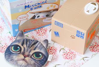 Comment résister à cette tirelire trop mignonne ?Je pense que vous avez compris le système. Il suffit de déposer une pièce sur la plaque où est dessiné un poisson et d'appuyer dessus.Ainsi le petit chat laisse entrevoir sa tête, puis sort sa patte de la boite pour attraper votre pièce et la garde précieusement à l'intérieur de la boîte avec lui ! Je crois que cette tirelire à amusé les enfants autant que nous et toute la monnaie de la maison a fini dans le carton avec le chat.C'est vraiment super original et ça va être difficile de choisir qui la prendra dans sa chambre ^_^