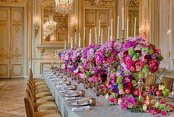 Voyage multi-sensoriel, avec la possibilité de prendre l’apéritif sur la terrasse adjacente aux salons, face à la Tour Eiffel illuminée, avant de poursuivre à table, avec un sens exceptionnel du raffinement : des bouquets signés du designer floral parisien de l’hôtel sont disposés en corne d’abondance comme unique chemin de table, une nappe de 9 mètres de long a été créée sur-mesure par la Maison Lelièvre et enfin, une vaisselle prestigieuse a elle aussi été créée tout spécialement par la manufacture française Haviland. Ce service de table en porcelaine « Couronne Impériale », symbolisé par différents détails comme l’abeille, l’aigle et la couronne impériale, a été minutieusement travaillé par les artisans de la manufacture de Limoges. Un dîner à la française Le Shangri-La Hotel, Paris a voulu ressusciter l’héritage et le savoir-vivre unique qu’est le « dîner à la française » en profitant du cadre somptueux des salons de réception. Tout d’abord, la personne qui reçoit est annoncée comme « Monsieur est servi » et ouvre les portes du salon, afin d’accueillir ses invités. S’ensuit l’annonce à voix haute – toujours par l’aboyeur – de chaque hôte, afin de rejoindre la table ornée de fleurs. Commence alors un menu en 4 services – potage, poisson, viande, dessert – servi « à la française », avec le raffinement d’une table d’initiés et des mets pour lesquels les convives se servent à leur convenance lors du passage du maître d’hôtel.