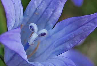 Campanula rapunculus (Campanule raiponce) : feuilles oblongues, ondulées, velues ; nombreuses fleurs bleues en grappes longues et étroites, sépales linéaires, corolle divisée au 1/3 de sa longueur.