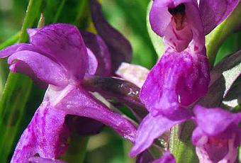 Dactylorhiza majalis (Orchis à larges feuilles, Orchis de mai) : fleurs rouge plus ou moins foncé ; sépales latéraux dressés, sépale dorsal en casque avec les pétales ; labelle trilobé ponctué de points et de courbes pourpres, éperon d'environ 3/4 de la longueur de l'ovaire.