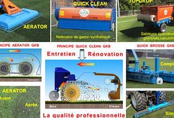 1/ Aérer et décompacter la couche superficielle du terrain grâce à l'AERATOR GKB - solution unique sur le marché ! - ainsi les billes caoutchouc (SBR ou autres), les impuretés et même les....bactéries sont ressorties ; sans parler des mousses et des mauvaises herbes qui ne peuvent s'installer avec les passages réguliers de l'AERATOR. De plus, les joueurs apprécient grandement l'effet de décompactage et d'assouplissement du terrain (moins de blessures aux articulations et tendons, plus de confort de jeu) réalisé par ce matériel dont l'effet comparable au décompacteur à dent sur un gazon naturel.