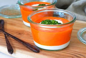 - Procédez au montage dans des bocaux, en tapissant le fond d’une couche de crème de chèvre, puis ajoutez la crème de poivron, terminez par une cuillère de chèvre sur laquelle vous disposerez une quenelle de pesto.