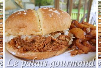 Mettre la sauce de cuisson dans une casserole à feu moyen et laisser réduire jusqu’à une consistance sirupeuse ou faire épaissir avec un peu de fécule de maïs délayer dans de l'eau froide. Ajouter la sauce à la viande effilochée, jusqu'à ce que la viande soit bien enrobée et en garnir des pains hamburgers et y ajouter de la salade de choux ou oignons rouge si désiré.