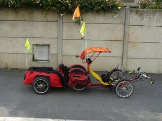 pour commencer, je dois dire que mon choix aura été encore le bon, il est vrais que l'on oublie facilement le remorque j'étais meme obligé de regarder dans les rétros pour voir si elle était toujours la sur le plat et dans les descentes cela donne un veritable avantage,cela pousse et donne des sensations nouvelles en aprécie la glisse, dans les cotes il est vrais que l'on a l'impression que quelqu'un nous tire en arrière mais j'ai fait l'essai sur une cote à 12% pour etre sur que cela ira, j'ai meme pas besoin de changer de cassette cela passe sans forcer avec mon 30x24.