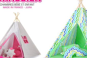 Petite entreprise familiale spécialisée depuis 1993 dans le mobilier et la décoration pour les chambres bébés et enfants de qualité, Jurassien étoffe sa gamme avec une toute nouvelle collection de tipis fabriqués en France ! Ces tentes en tissu et bois massif, à la fois solides et décoratives, sont proposées en différents coloris tendances, aussi bien pour une chambre fille que garçon :