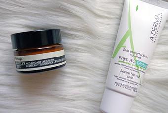 Une fois que j’ai la peau toute propre, j’applique mon contour de l’œil AESOP, et ma crème compensatrice Phys AC A-Derma.