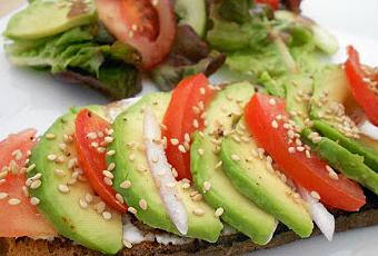 - Tartiner le pain de chèvre frais (ou de crème fraîche épaisse). Déposer dessus de façon alternée les lamelles d'avocat, de tomate & d'oignon.