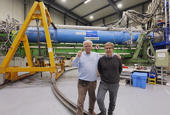 Konstantin Zioutas et Giovanni Cantatore, porte-parole de l'expérience CAST, ont participé à cette expérience avec laquelle on espérait détecter des particules exotiques émises par le trou noir situé au centre de notre galaxie (Image : Maximilien Brice/ CERN)